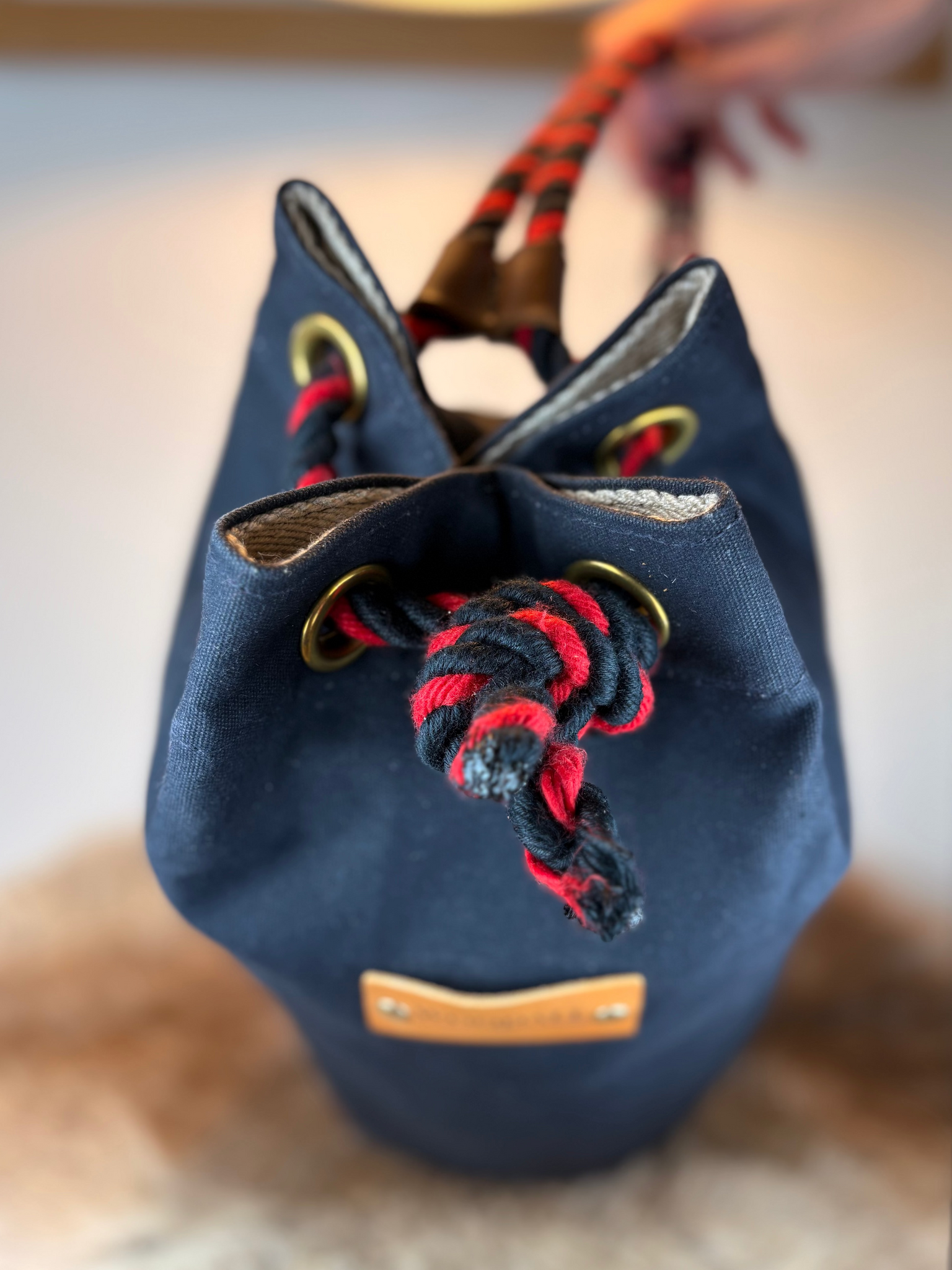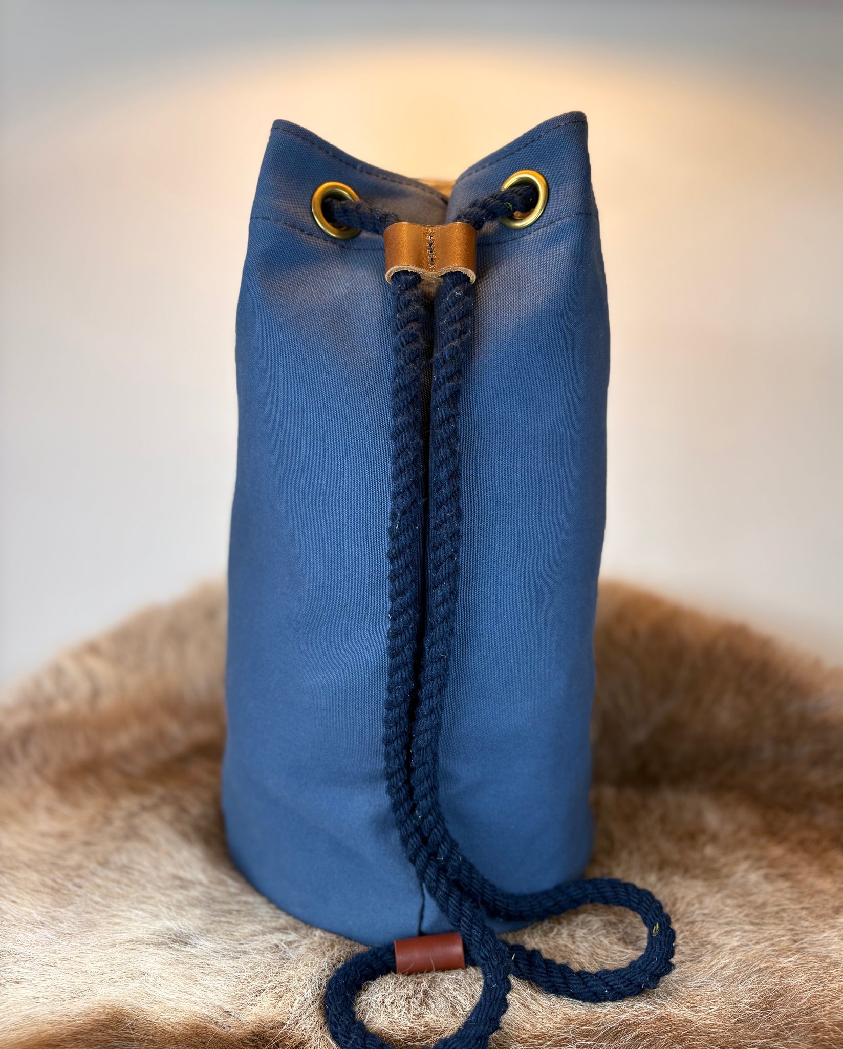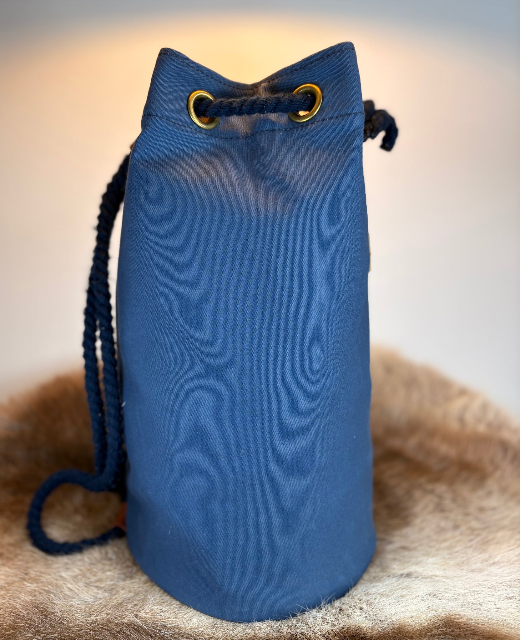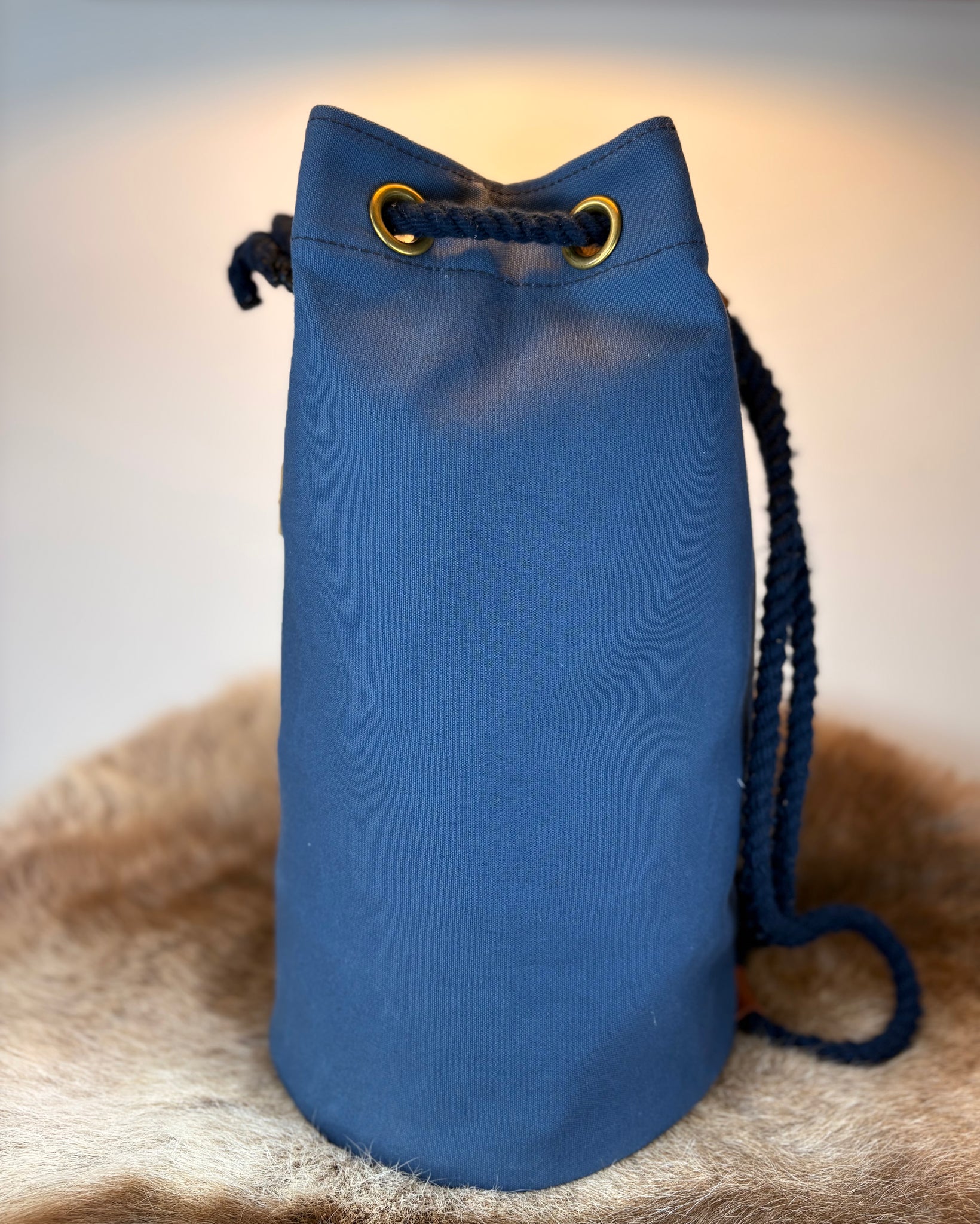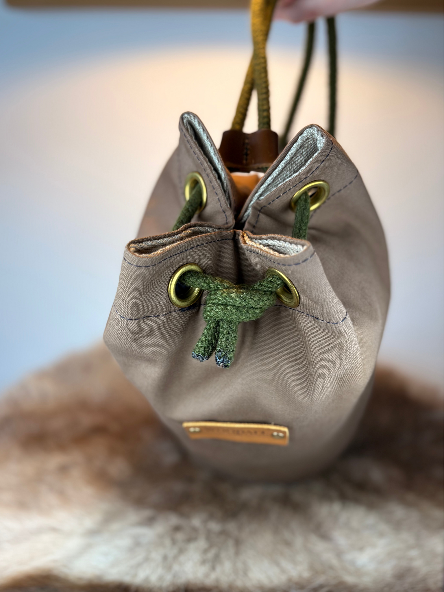 A delightful traditional duffel bag, inside there is a handy interior pocket with a metal carabiner clip. Our duffel has a durable, wipe clean PVC base, the neck is lined with an attractive natural webbing and has 8 brass eyelets securing the twisted rope to the duffel. The exterior includes an English leather toggle and loop. The duffel is stitched using quality industrial thread. This handmade duffel is the perfect bag for everyday use, sling over the shoulder and go!