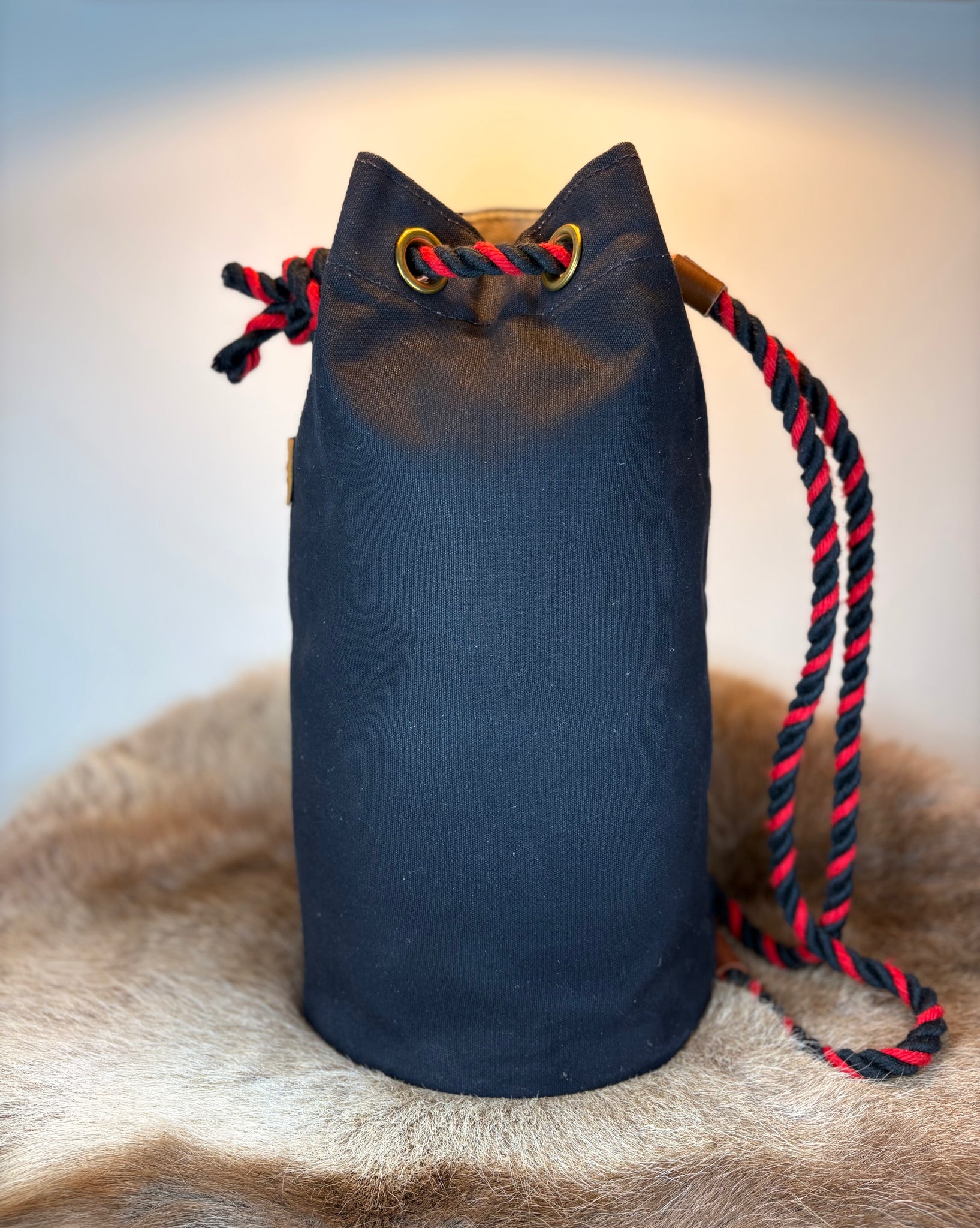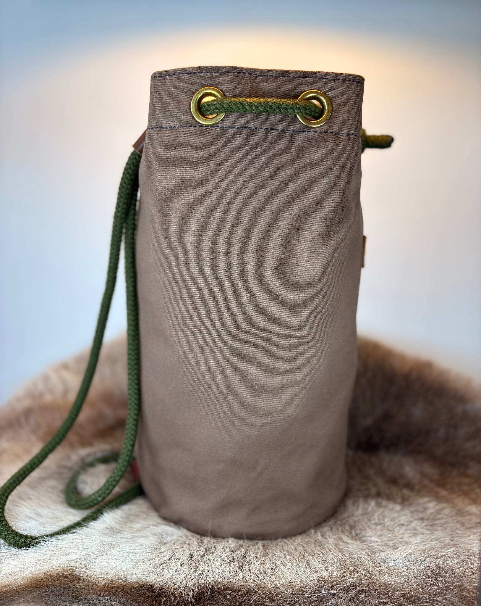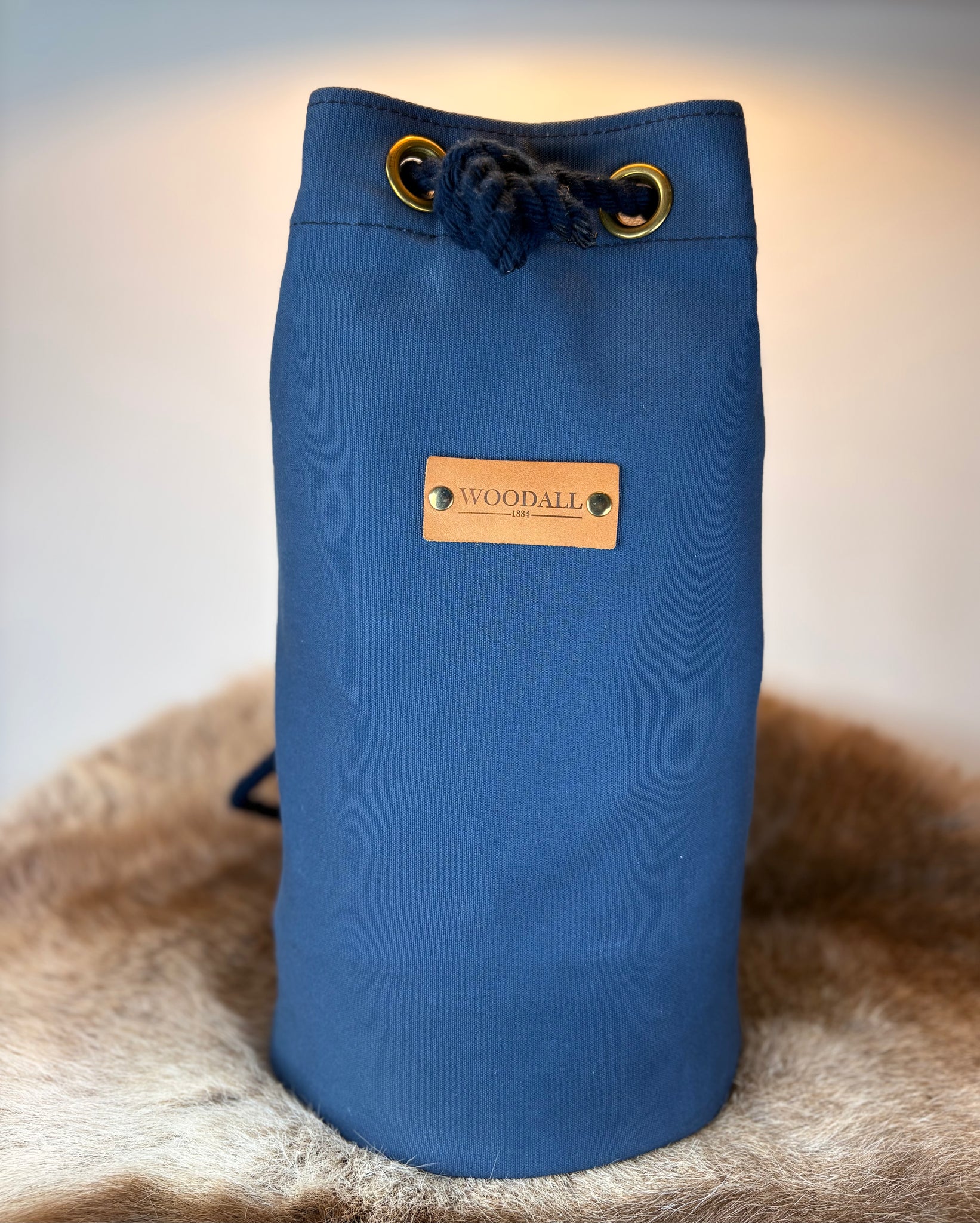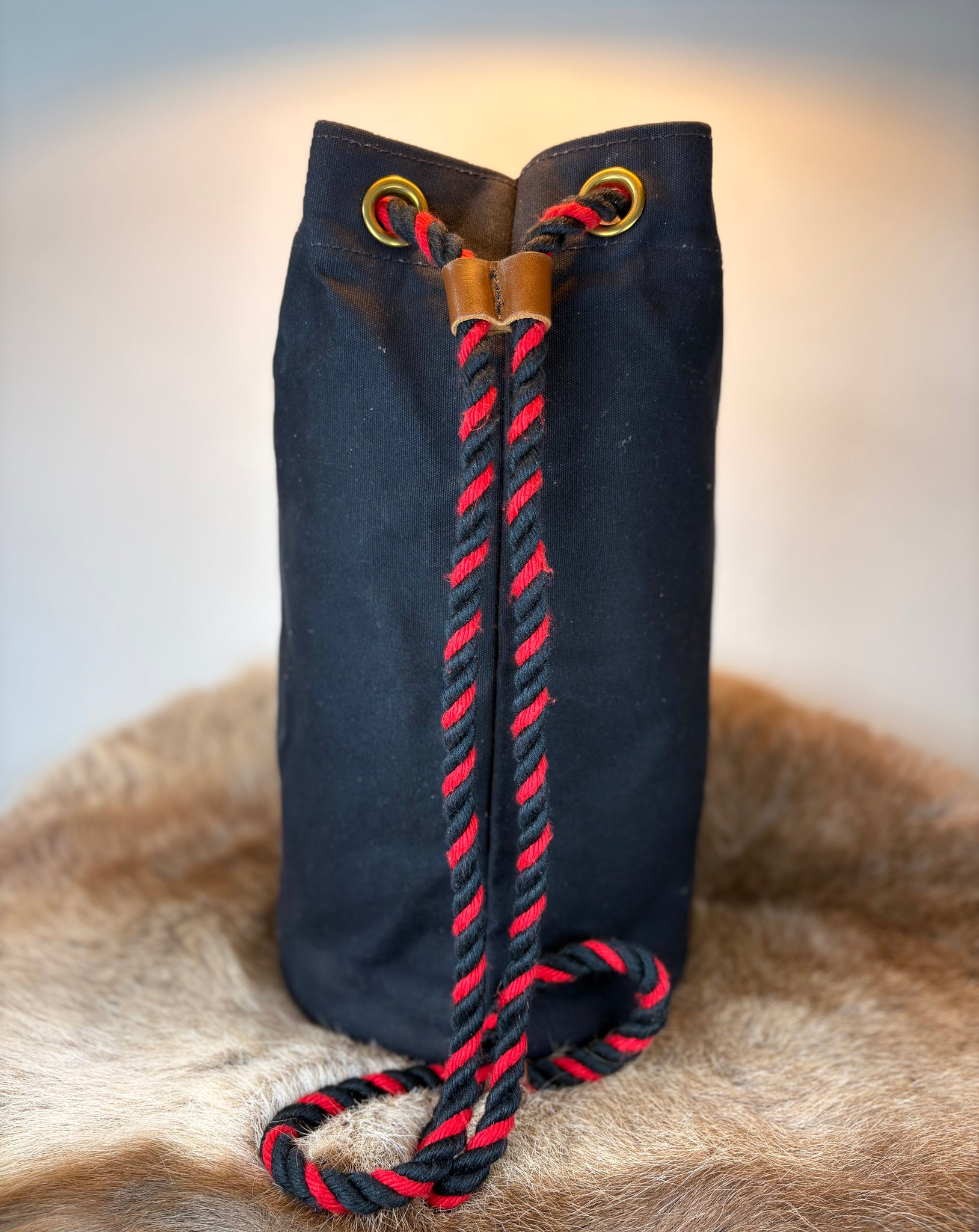 A delightful traditional duffel bag, inside there is a handy interior pocket with a metal carabiner clip. Our duffel has a durable, wipe clean PVC base, the neck is lined with an attractive natural webbing and has 8 brass eyelets securing the twisted rope to the duffel. The exterior includes an English leather toggle and loop. The duffel is stitched using quality industrial thread. This handmade duffel is the perfect bag for everyday use, sling over the shoulder and go!