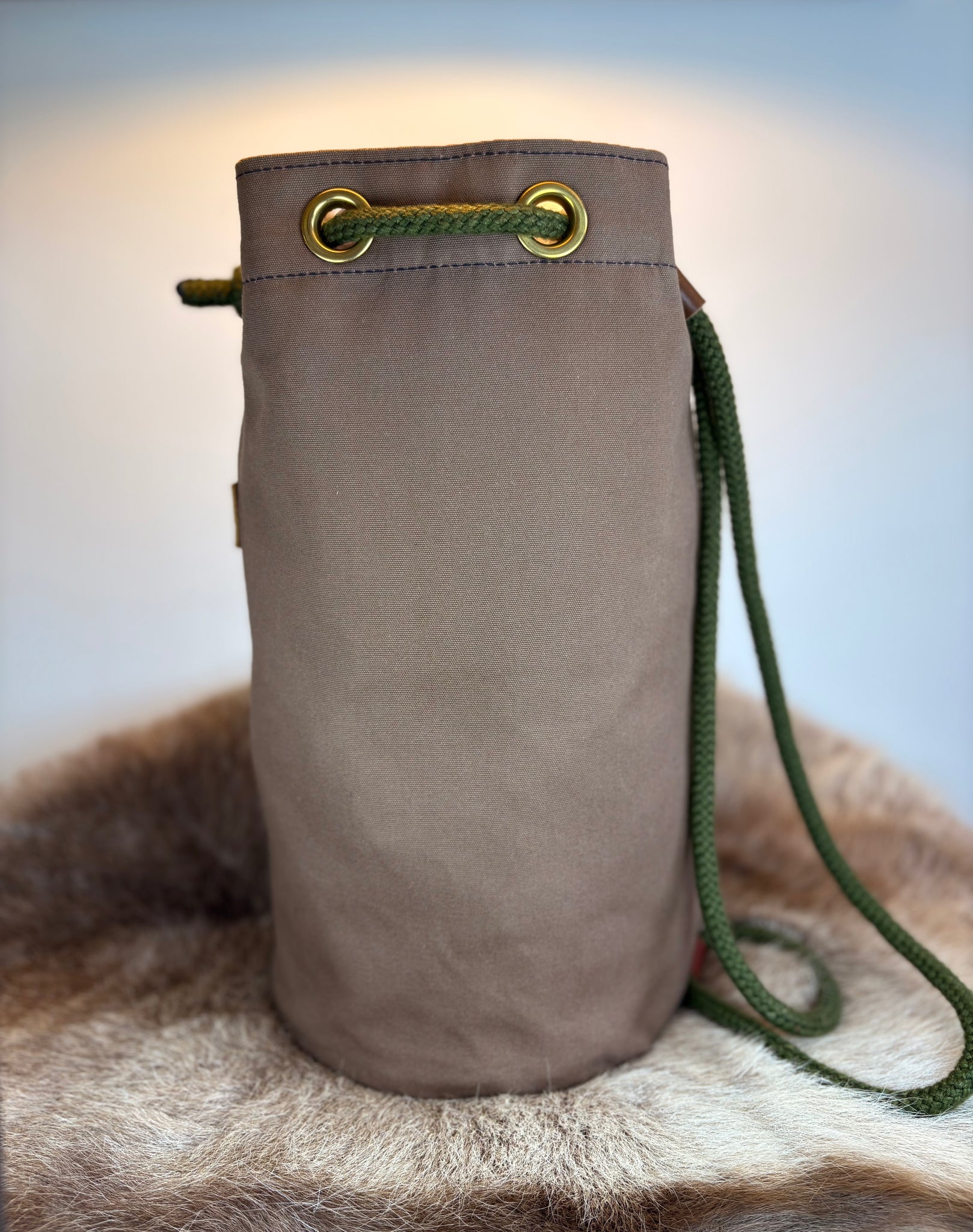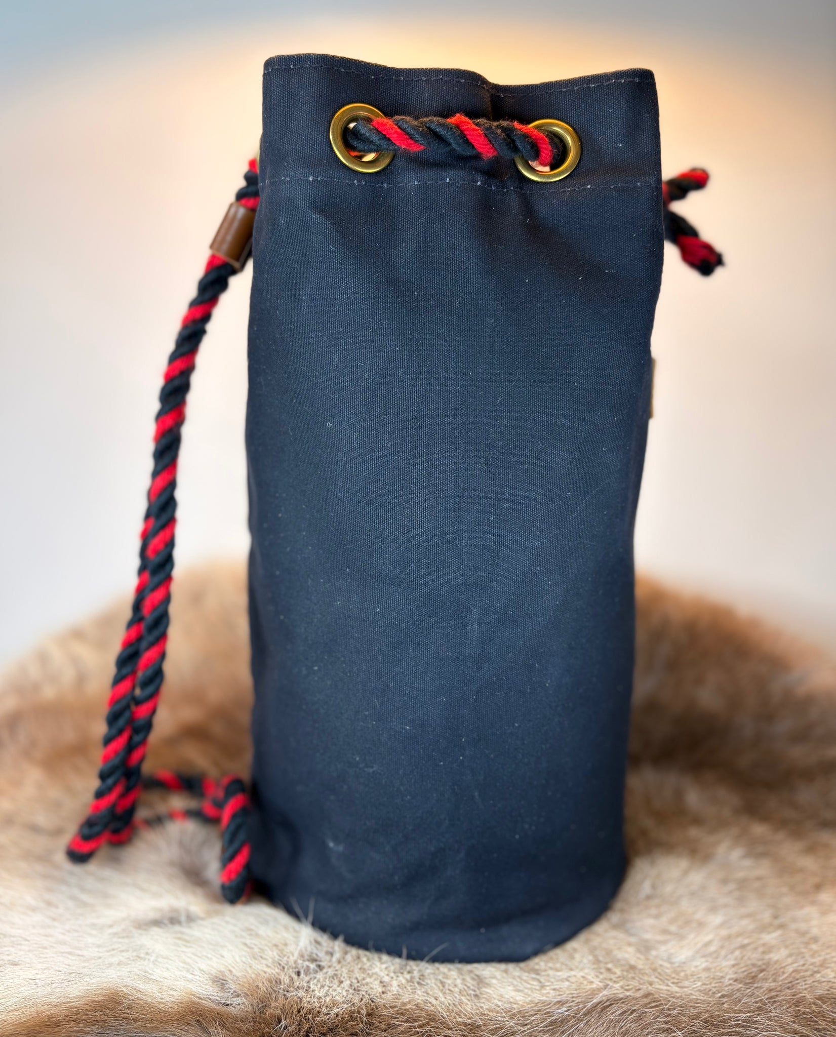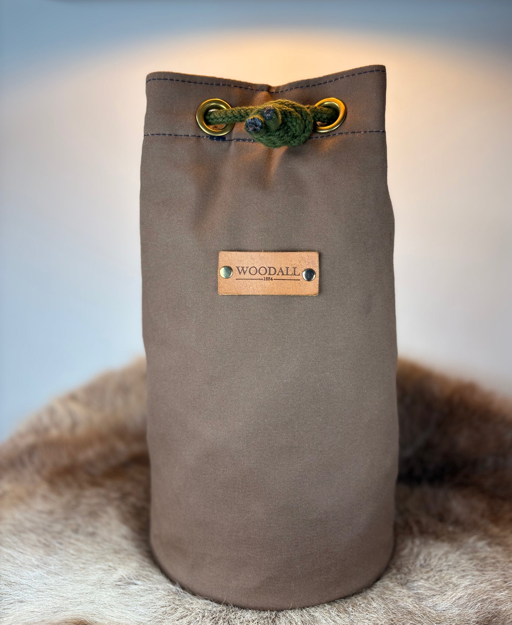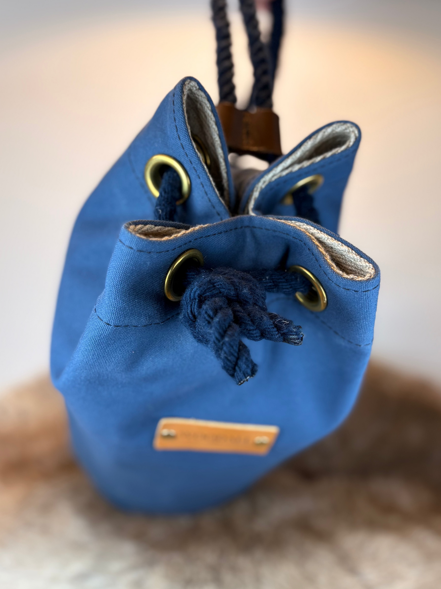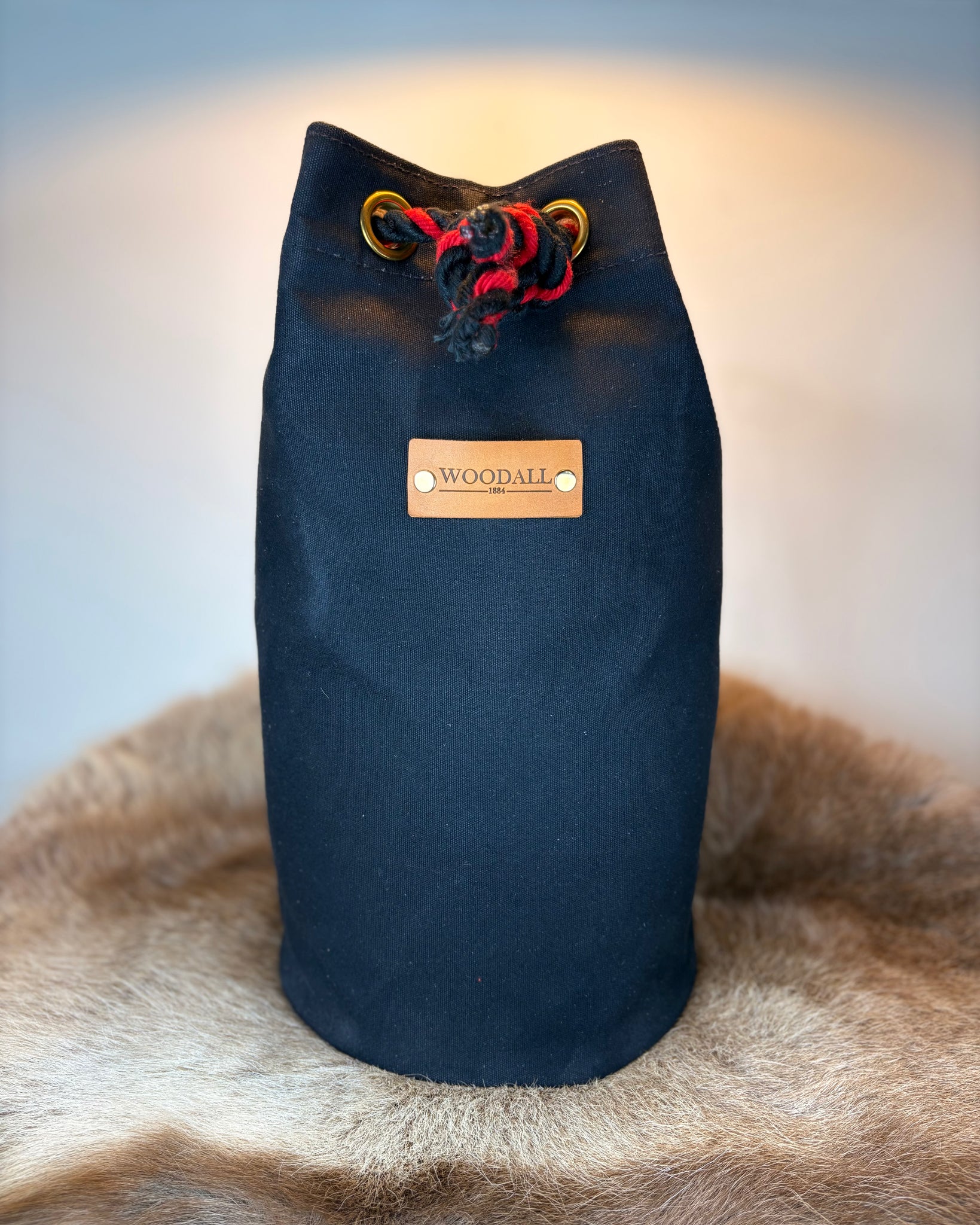 A delightful traditional duffel bag, inside there is a handy interior pocket with a metal carabiner clip. Our duffel has a durable, wipe clean PVC base, the neck is lined with an attractive natural webbing and has 8 brass eyelets securing the twisted rope to the duffel. The exterior includes an English leather toggle and loop. The duffel is stitched using quality industrial thread. This handmade duffel is the perfect bag for everyday use, sling over the shoulder and go!
